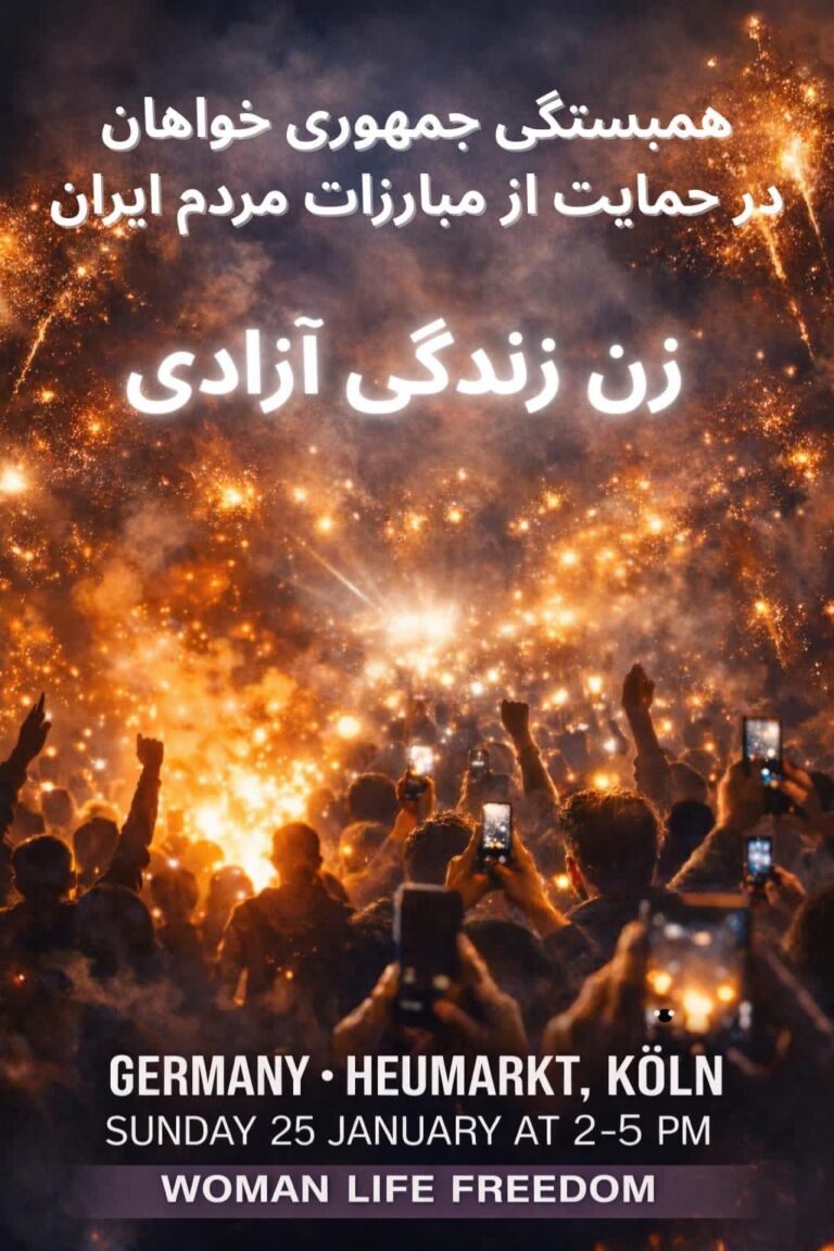 ما، جمهوری‌خواهان ایران، در گردهمایی سراسری خود در شهر کلن، همبستگی کامل خود را با قیام بزرگ و سراسری مردم ایران اعلام می‌کنیم. جنبشی که با شعار «زن، زندگی، آزادی» آغاز شد، مراحل مهمی را پشت سر گذاشته و امروز با پیوند گسترده و همگانی مردم همه مناطق کشورمان — کارگران و مزدبگیران، فرودستان، حاشیه‌نشینان شهری، کسبه و سایر اقشار جامعه — به خیزشی سرتاسری برای نجات مردم ایران بدل شده است.